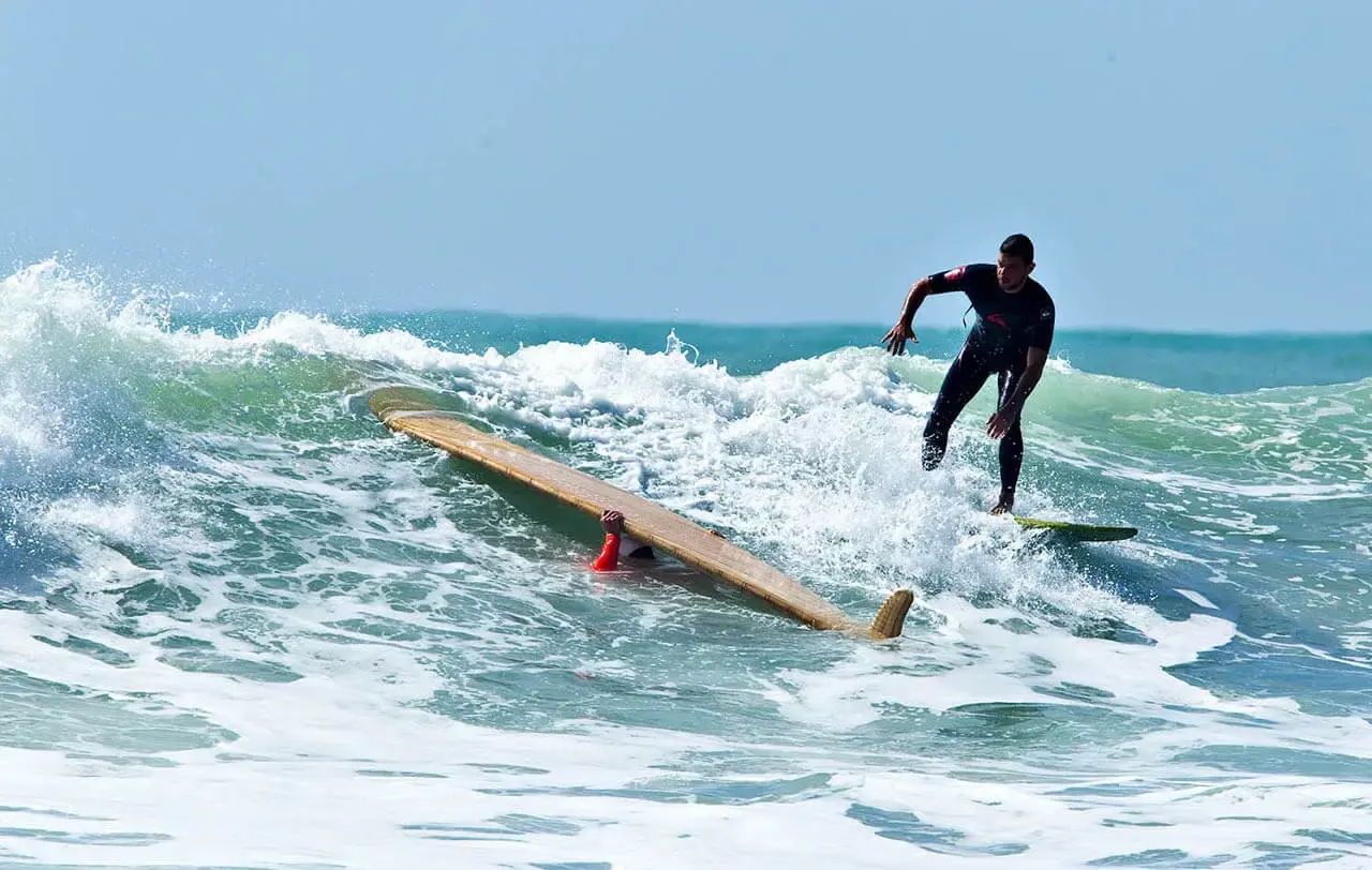 4. Следующий этап — это нырок под воду вместе с доской. В это время доску нужно протолкнуть ещё дальше руками и ногой, а также прижаться к ней грудью. Вторая нога при этом задирается как можно выше. Чем выше вы её поднимите, тем глубже будет нырок под воду.