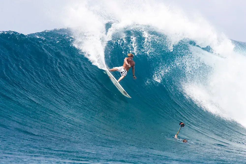 Правильно сделанный флоатер очень эффектен. Он заключается в том, что, когда перед сёрфером начинает падать секция волны, он не объезжает её снизу, а заезжает на самый гребень и скользит по нему горизонтально.