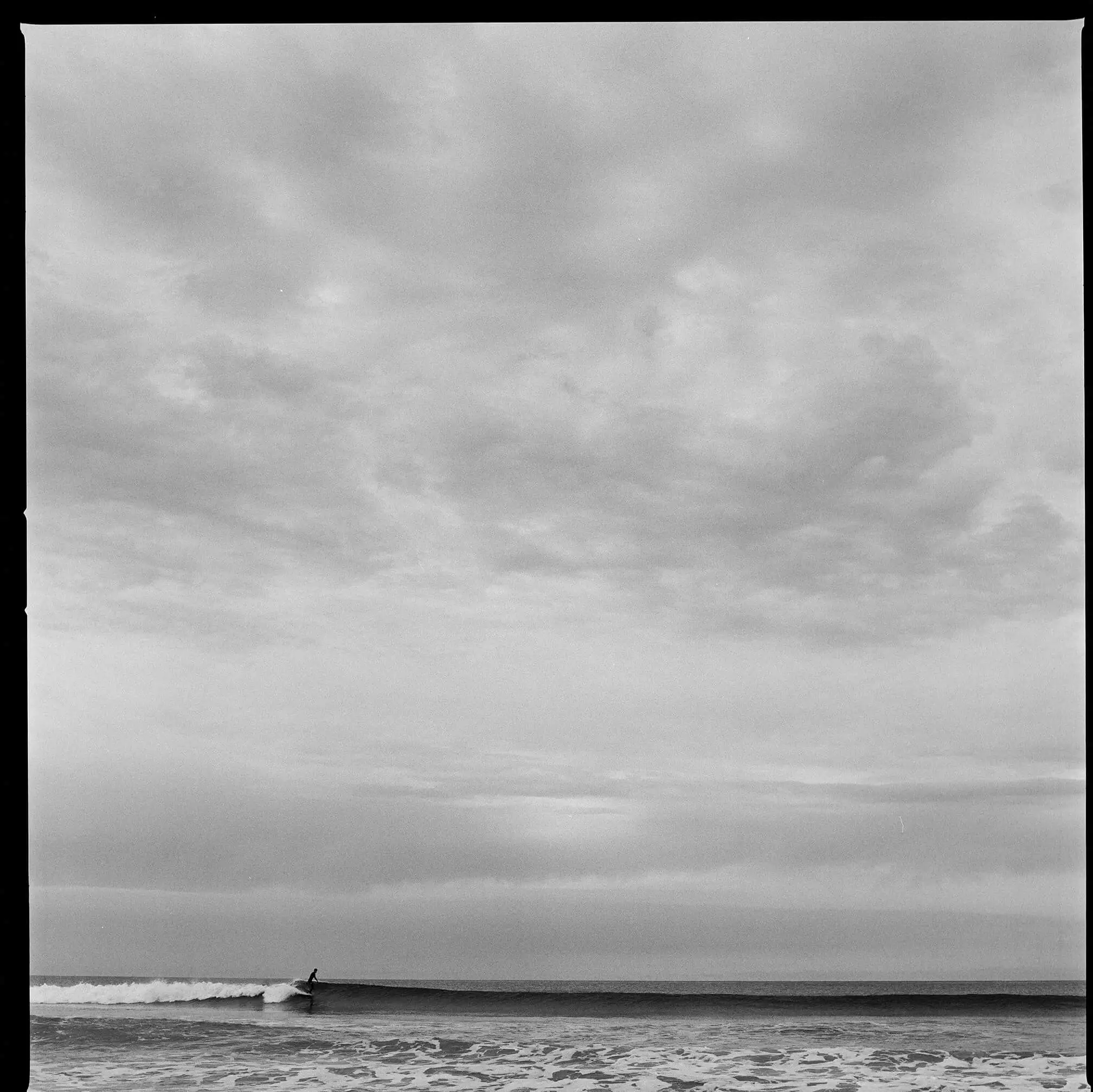 “Волна на Сисайде больше подходит для коротких досок, чем для длинных. Но пару лет назад там была песчаная банка, благодаря которой на приливе вставала очень фановая левая волна. Волны были не выше пояса и Джоель Тюдор выплыл туда на своём лонгборде. Я уже упаковал всё своё фотообрудование для трипа, в который я уезжал тем вечером, когда мне позвонил Джоель и сказал, что волны идеальны. Поэтому я пришёл со среднеформатной камерой — единственной, которую не упаковал. Часто я черпаю вдохновение из живописи местного художника Уэйда Коняковски и того, как он использует правило третей и негативное пространство. Эта фотография — дань уважения его творчеству.»