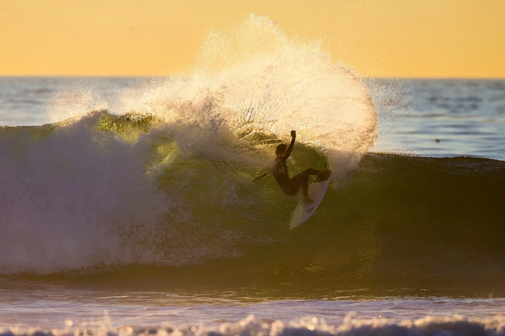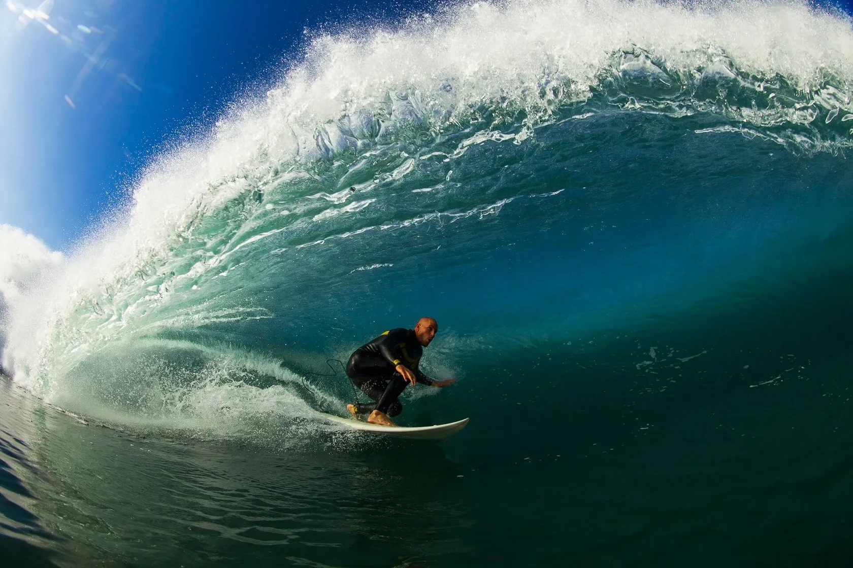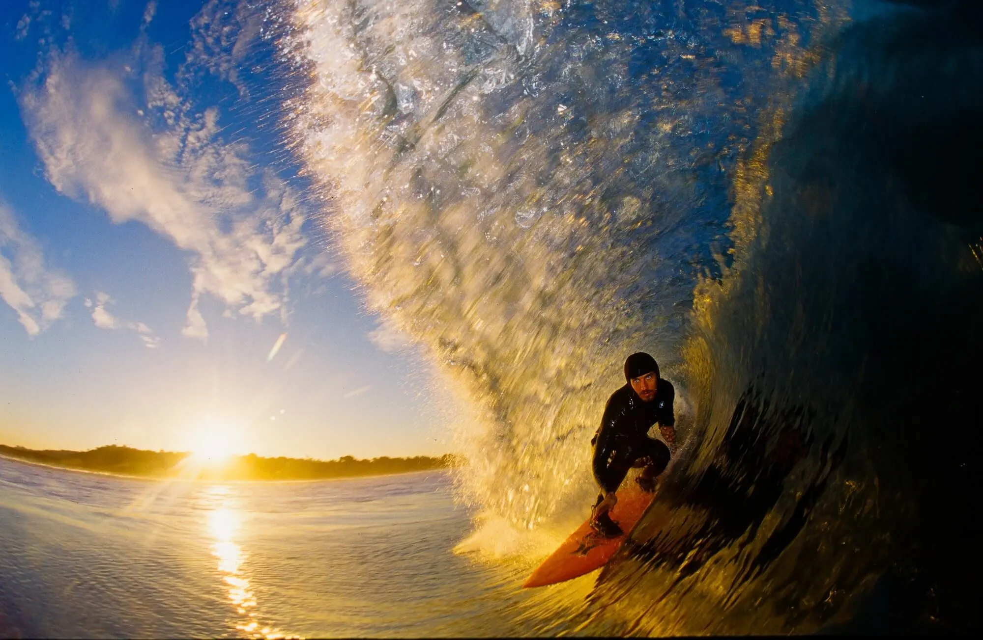 “Когда постоянно снимаешь один и тот же спот, со временем снимки начинают быть очень похожими друг на друга. Так что, в это конкретное утро я подумал, что было бы круто поснимать фишаём со вспышкой. В Сисайде есть три разных пика. Левая волна в инсайде называется Palisades, дальше находится Outside reef, а в инсайде на севере волну зовут Parking Lots. Паркинг Лотс — обычно правая, но иногда здесь встаёт и левая волна, как на этом снимке с Робом Мачадо. Это последняя фотография, которую я смог снять до того, как солнце встало слишком высоко. Поэтому после неё я положил камеру и пошёл серфить.”