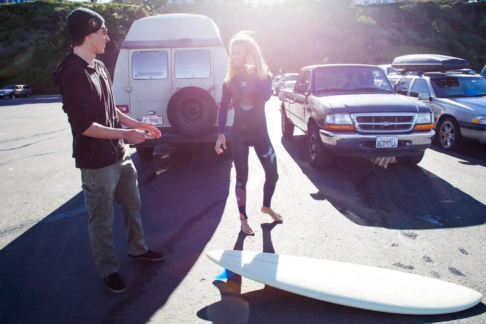 “Сисайд — это не только волны, но также и люди, которые тусуются на парковке. Это почти как твой второй дом. На этом снимке — Роб Мачадо и Райан Бёрч. Скорей всего, они говорят о дизайне досок — Роб только что сделал этот сингл фин 7’3. Это одна из классных сторон Сисайда: ты можешь приехать туда и встретить людей из разных жизней и разных поколений. Ты можешь пойти туда и взять попробовать чью-нибудь доску, выпить кофе или просто потусоваться с кем-нибудь из завсегдатаев парковки.”