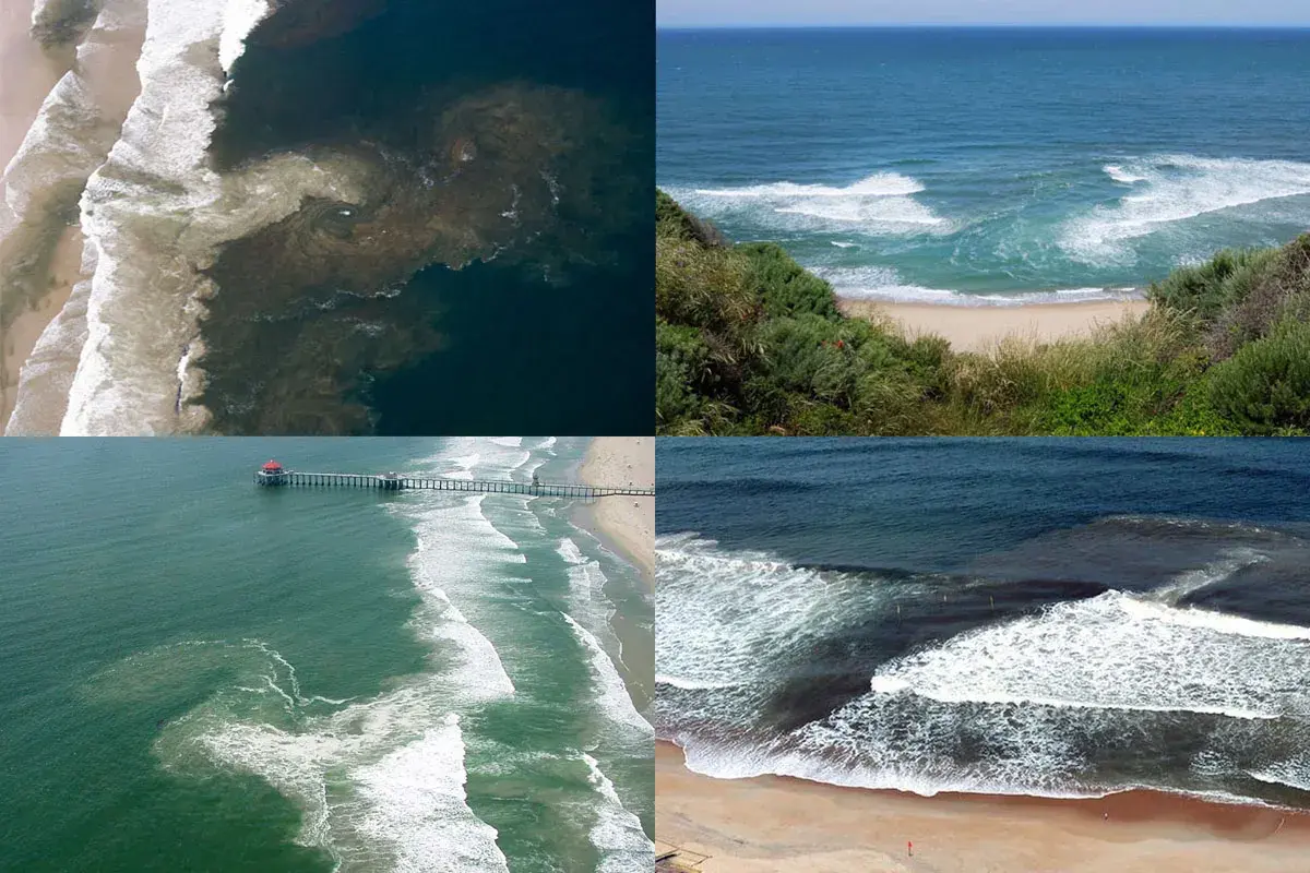 Отбойные течения подразделяются на несколько видов в зависимости от формы береговой линии и рельефа дна.
