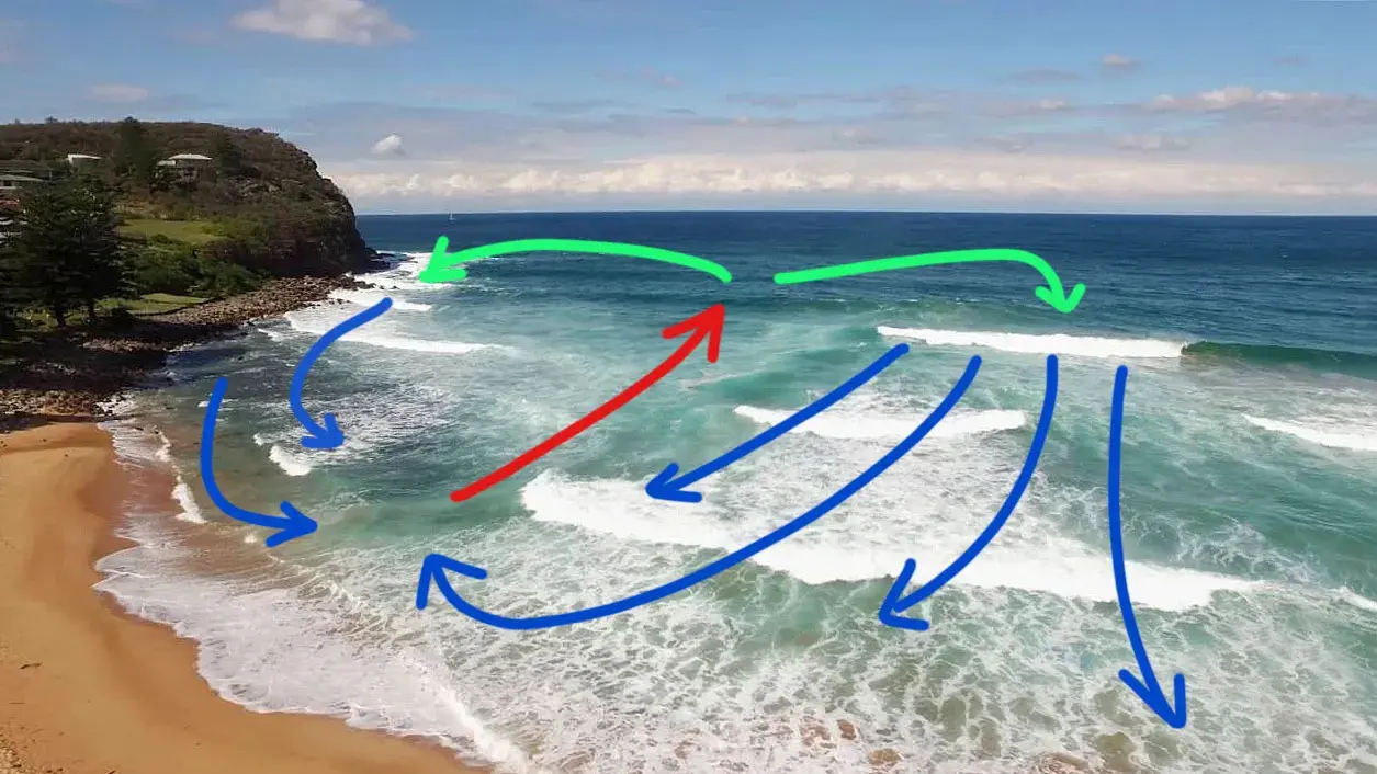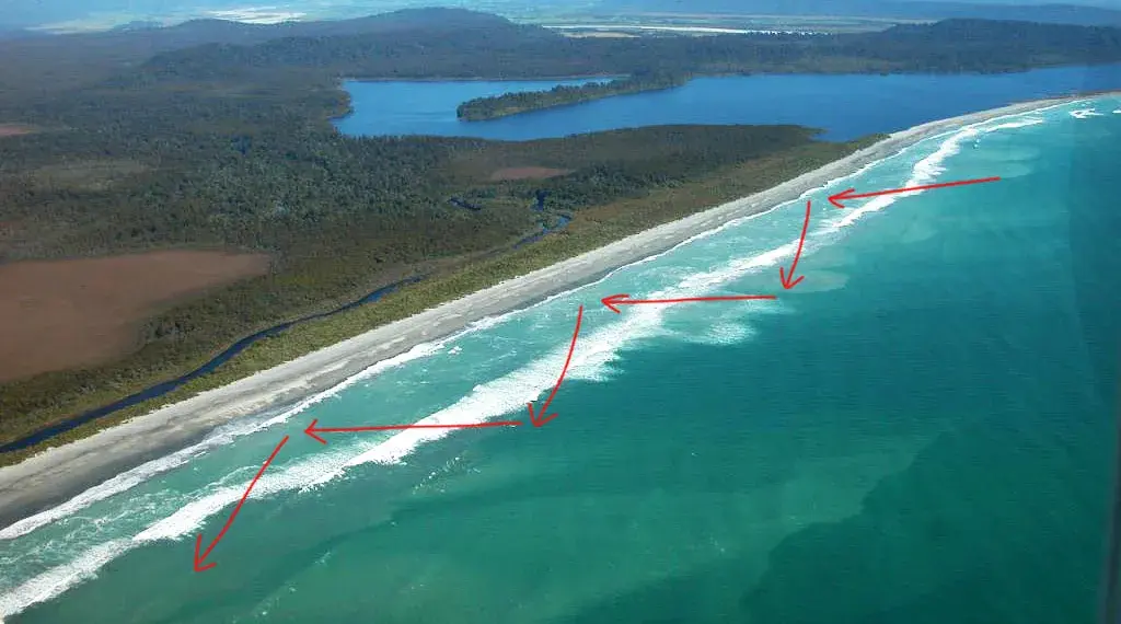 Есть ещё один вид течений, возникающих благодаря волнам, который стоит упомянуть. Это боковое течение, которое направлено вдоль берега. И мы сейчас говорим не про любое течение, направленное в бок. Мы имеем ввиду такое течение (английский термин longshore current), которое возникает там, где рельеф береговой линии не изменяется на большой расстоянии, и где волны подходят к берегу под углом. Примером такого берега являются длинные песчаные пляжи. В подобных местах образуются течения, которые зигзагами уносят ничего неподзревающих купальщиков и сёрферов вдоль берега. Если сёрфер зайдёт в воду на пляже с таким течением и не будет следить за своим положением относительно ориентиров на берегу, его может унести довольно далеко от места входа в воду.