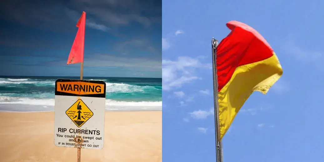 6. Красные флаги. Если на пляже работают спасатели, то они ставят специальные флаги у воды, которые обозначают безопасные места и области с течением. Два или больше красных флага обозначают область с опасным течением. Два красно-жёлтых флага обозначают безопасное место для купания, за которым спасатели внимательно наблюдают.