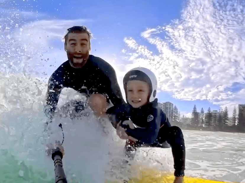 «Он катается на доске примерно с года», — объяснил Джордон. «Затем он «переехал» ко мне на спину, и мы вместе занимаемся сёрфингом, начиная примерно с двух лет».